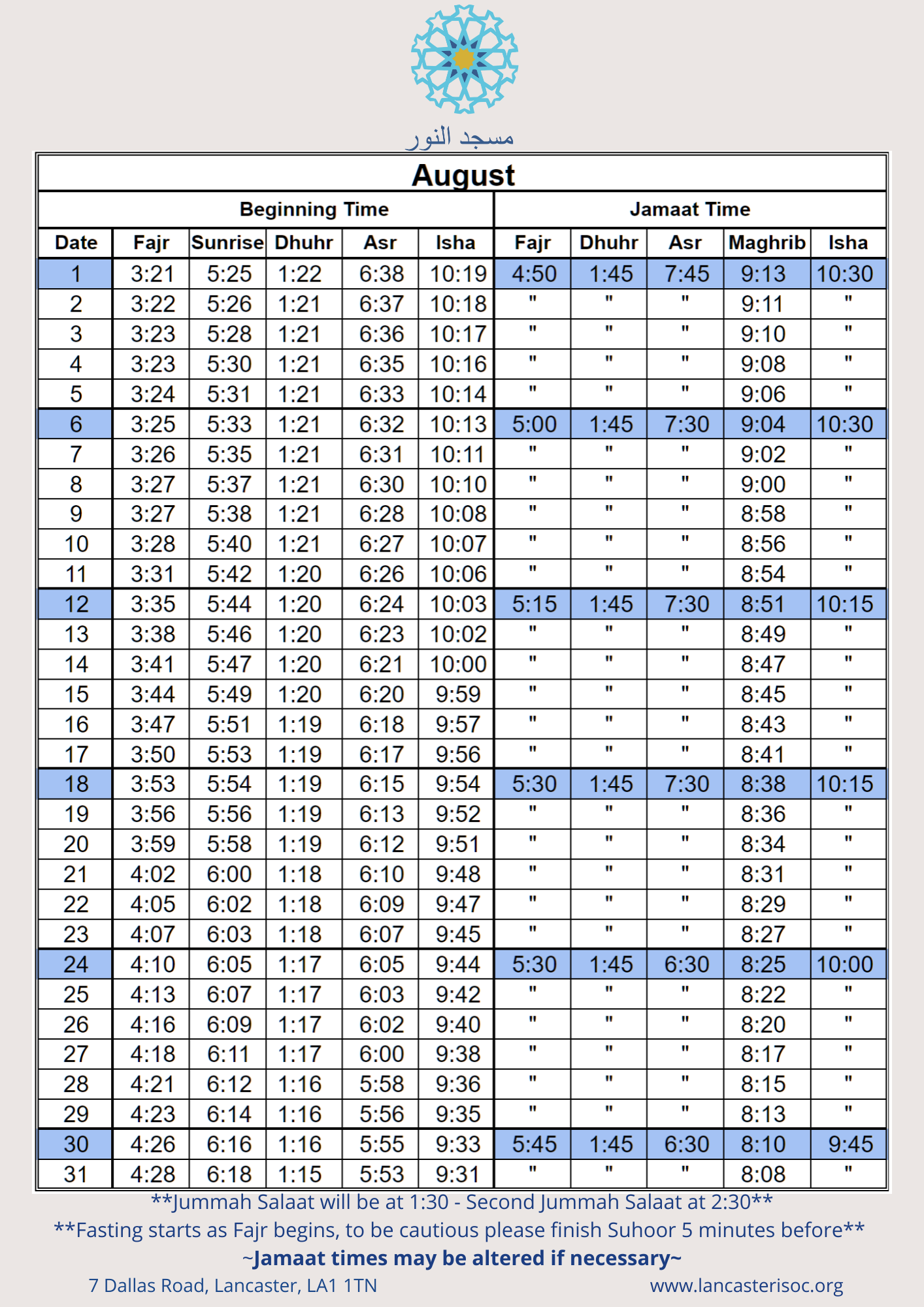 Mon 8 December 2025 / 17 Jumada Al Akhira 1447 11:49 PM Download The Masjid-Timetable App for Apple or AndroidTo see how we have calculated the beginning times tap here
